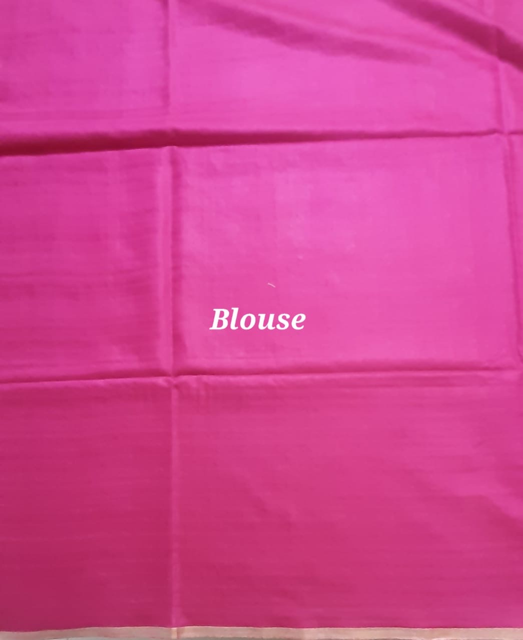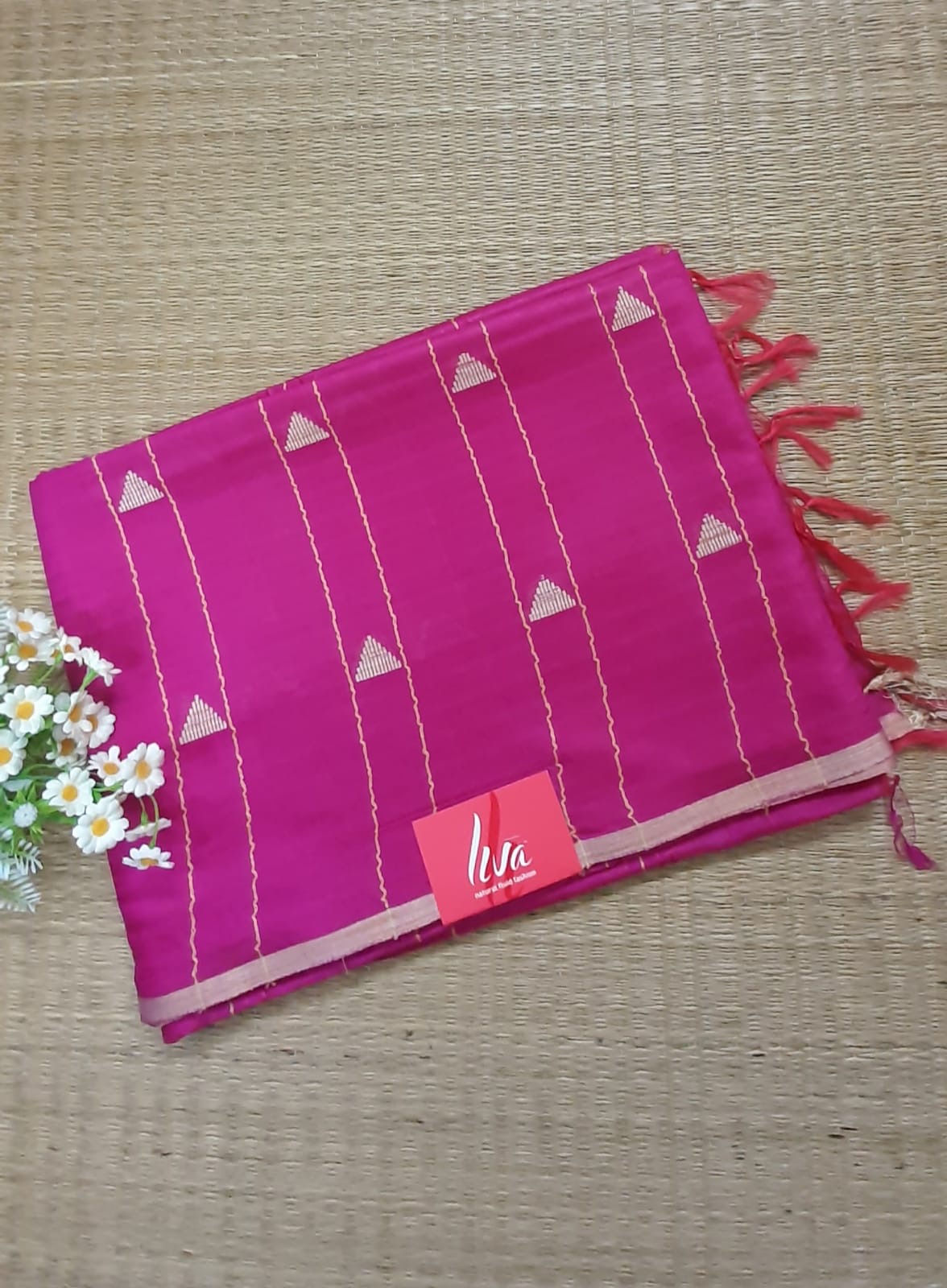 Bhagalpuri ghicha tussar silk saree in Lotus Pink color with woven stripes and temple pattern all over the body and thin zari border with ghicha pallu and tassels. It comes with plain running blouse with zari border.