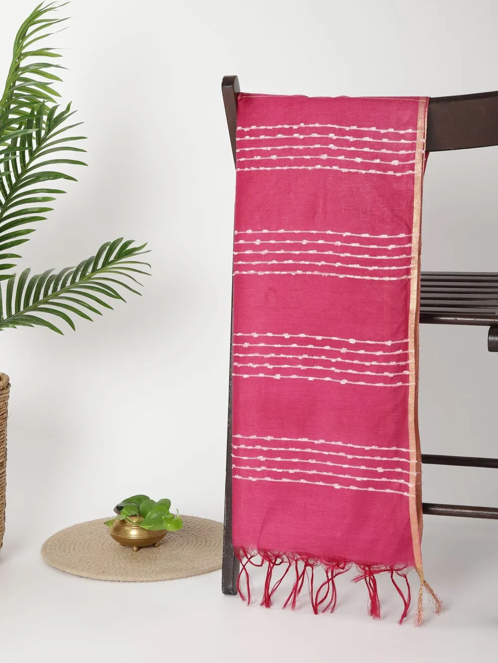 Bhagalpuri ghicha silk saree in Mauve Pink color with woven stripes and temple pattern all over the body and thin zari border with ghicha pallu and tassels. It comes with plain running blouse with zari border.