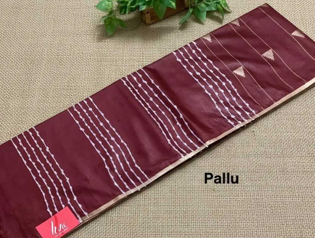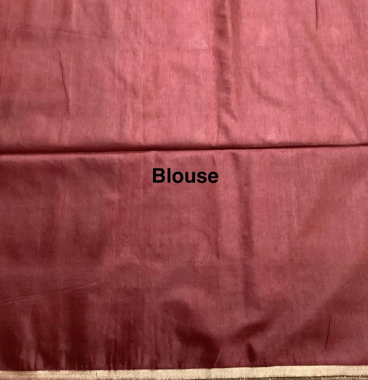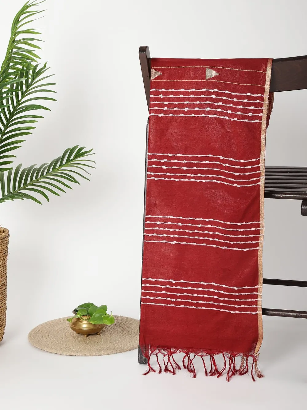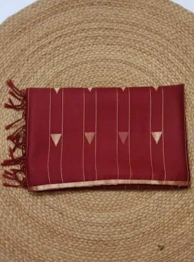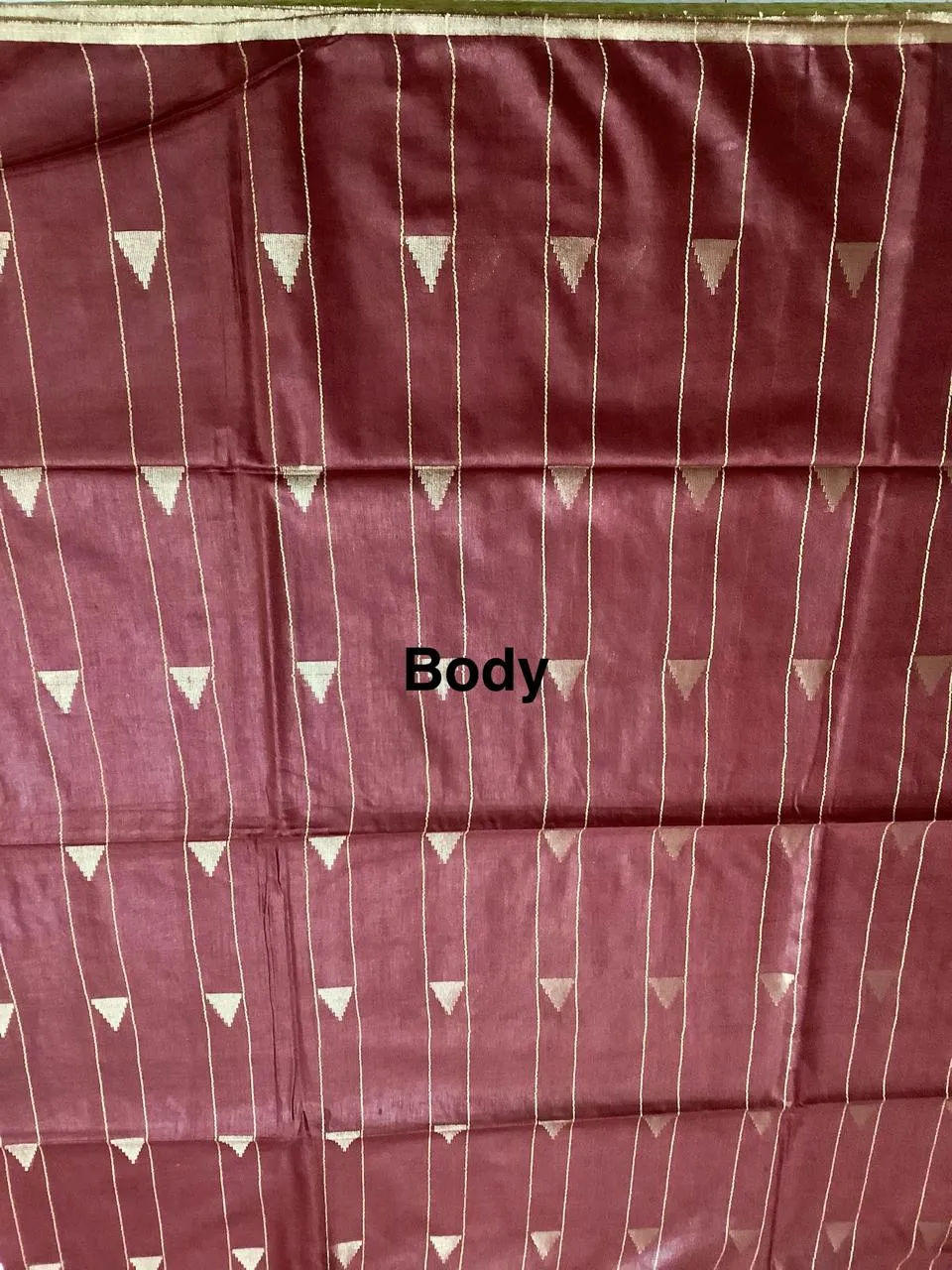 Bhagalpuri ghicha silk saree in Rust Brown color with woven stripes and temple pattern all over the body and thin zari border with ghicha pallu and tassels. It comes with plain running blouse with zari border.