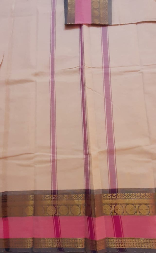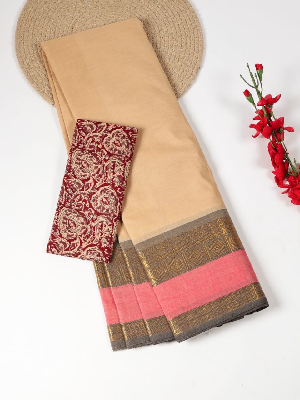 Beige Kanchi Cotton Saree with contrast Pink zari border with simple line pallu and Maroon Kalamkari blouse.