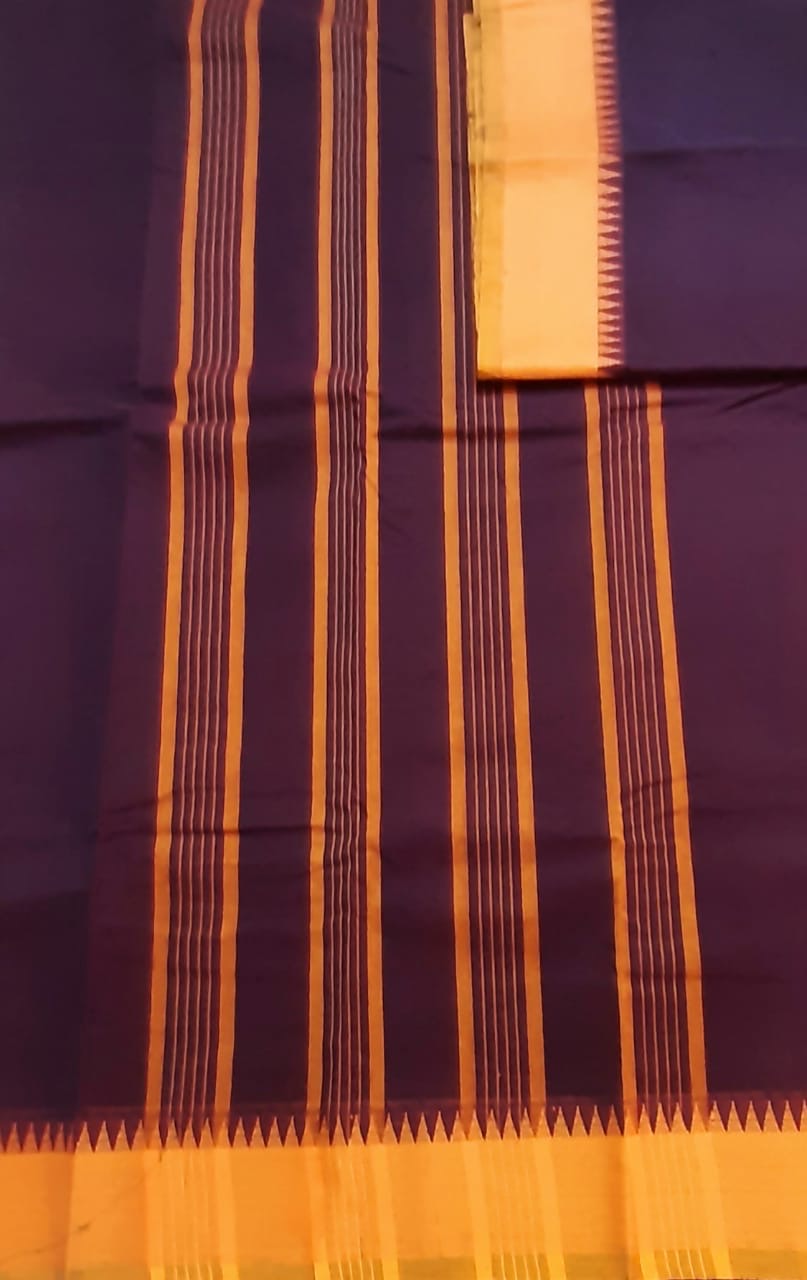 Coffee Brown Kanchi Cotton Saree with contrast Mustard border with simple line pallu and Brown Kalamkari blouse.