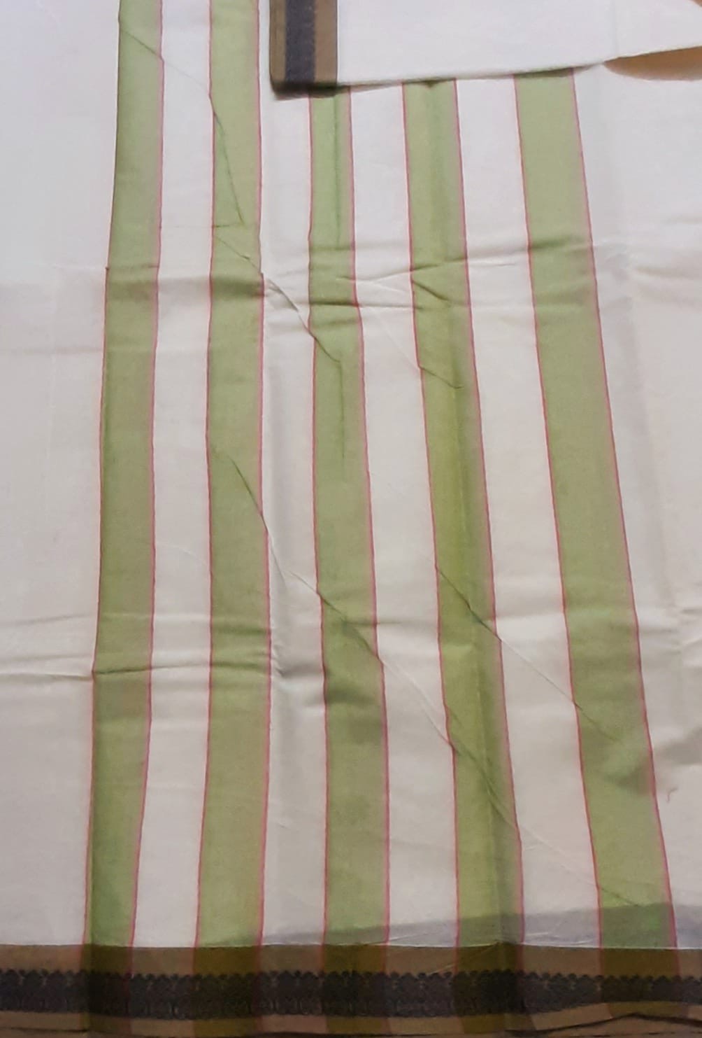 Cream White Kanchi Cotton Saree with contrast Olive Green thread border with simple line pallu and Olive Green Ikat blouse.