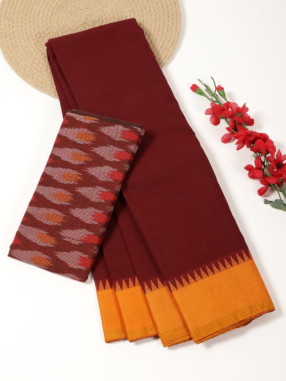 Maroon Kanchi Cotton Saree with contrast Mustard border with simple line pallu and Maroon Ikat blouse.