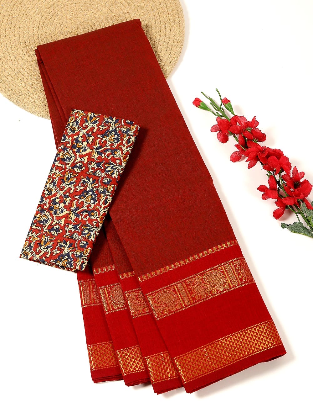 Maroon Kanchi Cotton Saree with contrast Red zari border with simple line pallu and extra Red Kalamkari blouse.