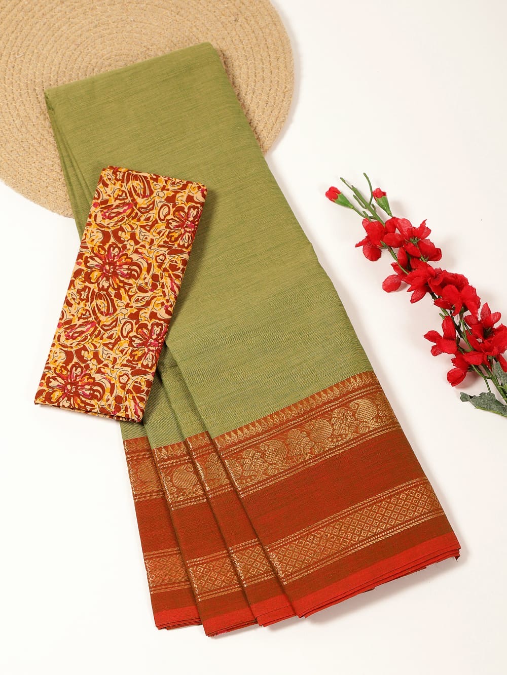 Pista Green Kanchi Cotton Saree with contrast Brick Orange zari border with simple line pallu and Orange Kalamkari blouse.