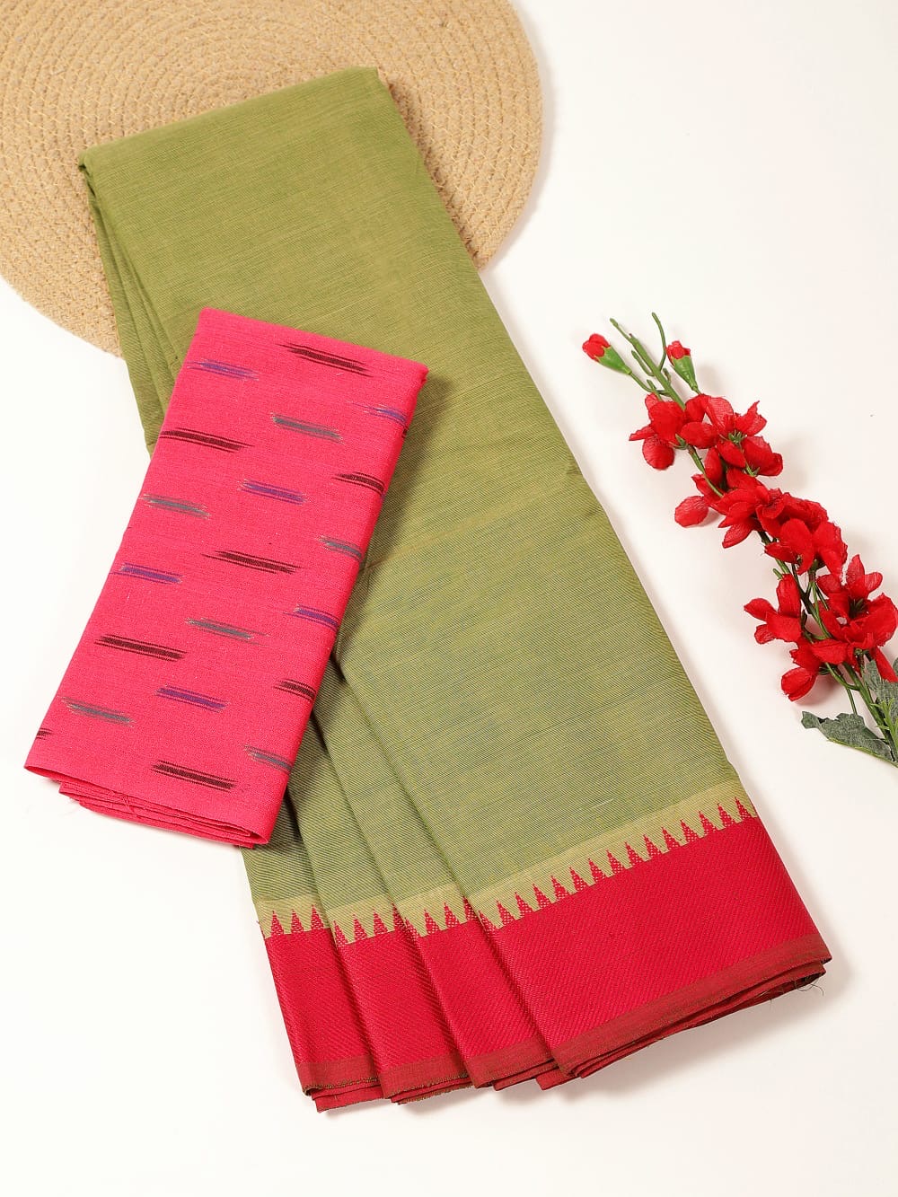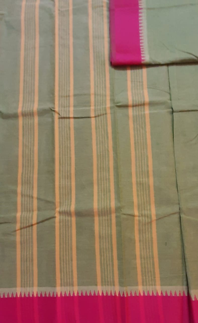 Pista Green Kanchi Cotton Saree with contrast Pink border with simple line pallu and Pink Ikat blouse.