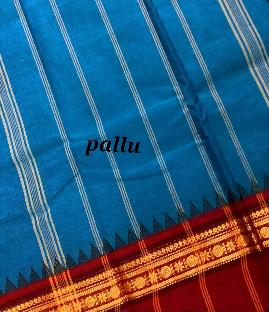 Beautiful Blue and Maroon Kanchi Cotton Saree with contrast Maroon zari border with simple line pallu and extra Blue Kalamkari blouse.