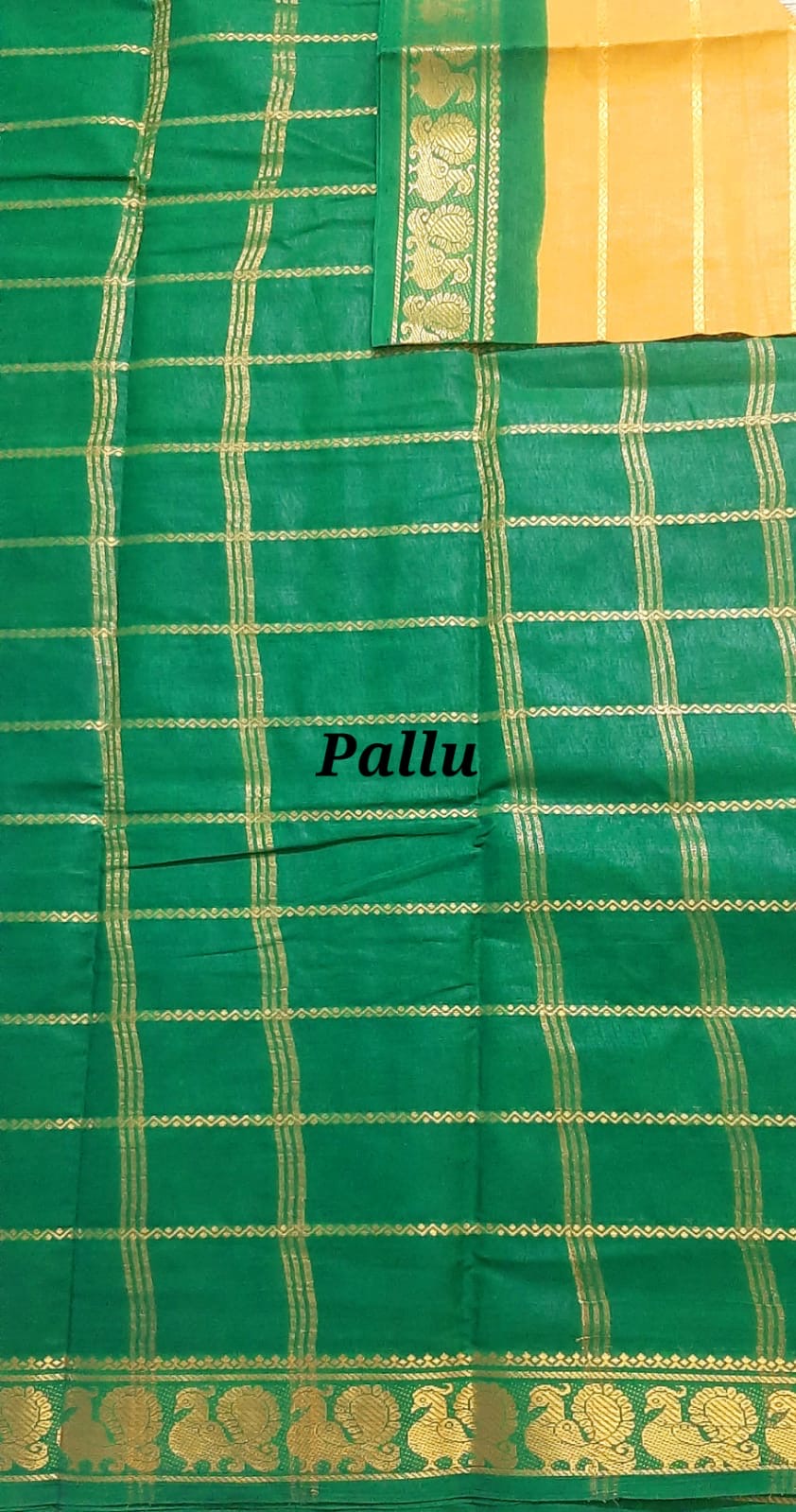 Pure Madurai Sungudi Cotton saree in Velthari zari stripes design in Mustard Yellow colour with contrast Green colour zari border and blouse.