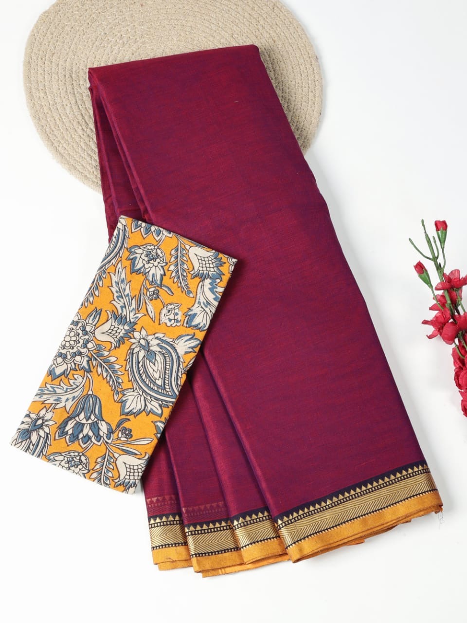 Soft and breathable Narayanpet Mercerized Cotton saree in Magenta color with thin Mango Yellow thread woven border with simple pallu and tassels. It comes with running blouse and extra Mango Yellow Kalamkari cotton blouse.