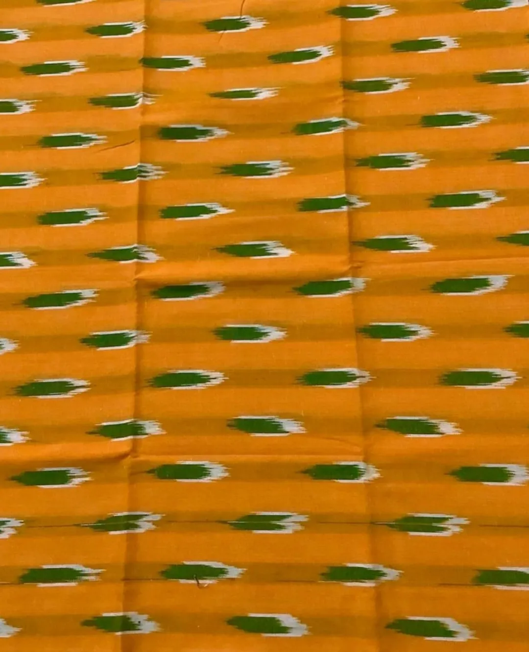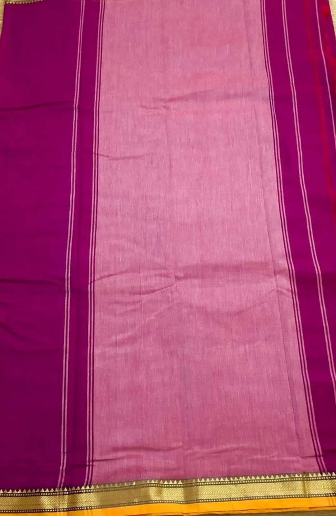 Soft and breathable Narayanpet Mercerized Cotton saree in Magenta color with thin Mango Yellow thread woven border with simple pallu and tassels. It comes with running blouse and extra Mango Yellow Ikat cotton blouse.