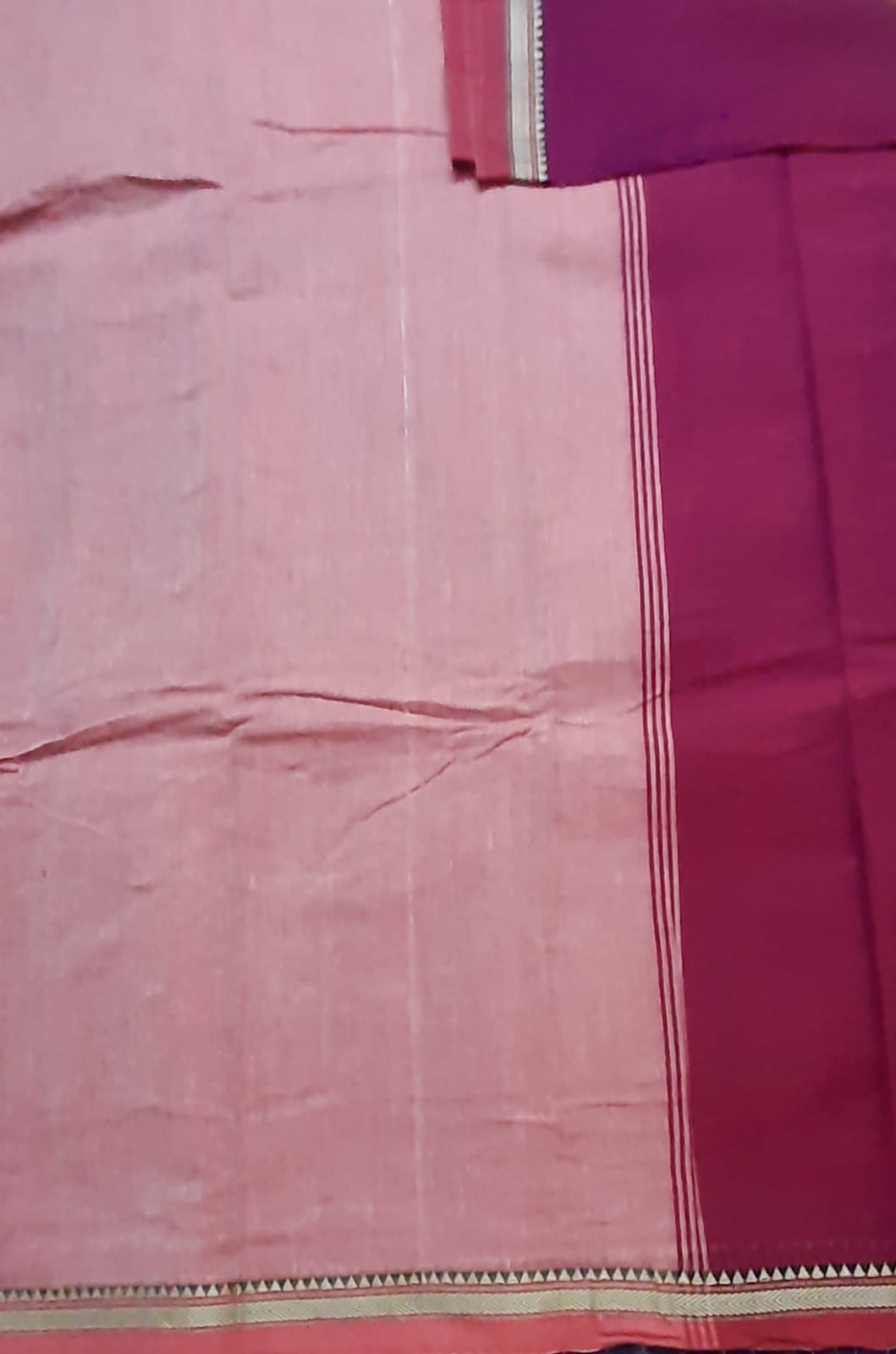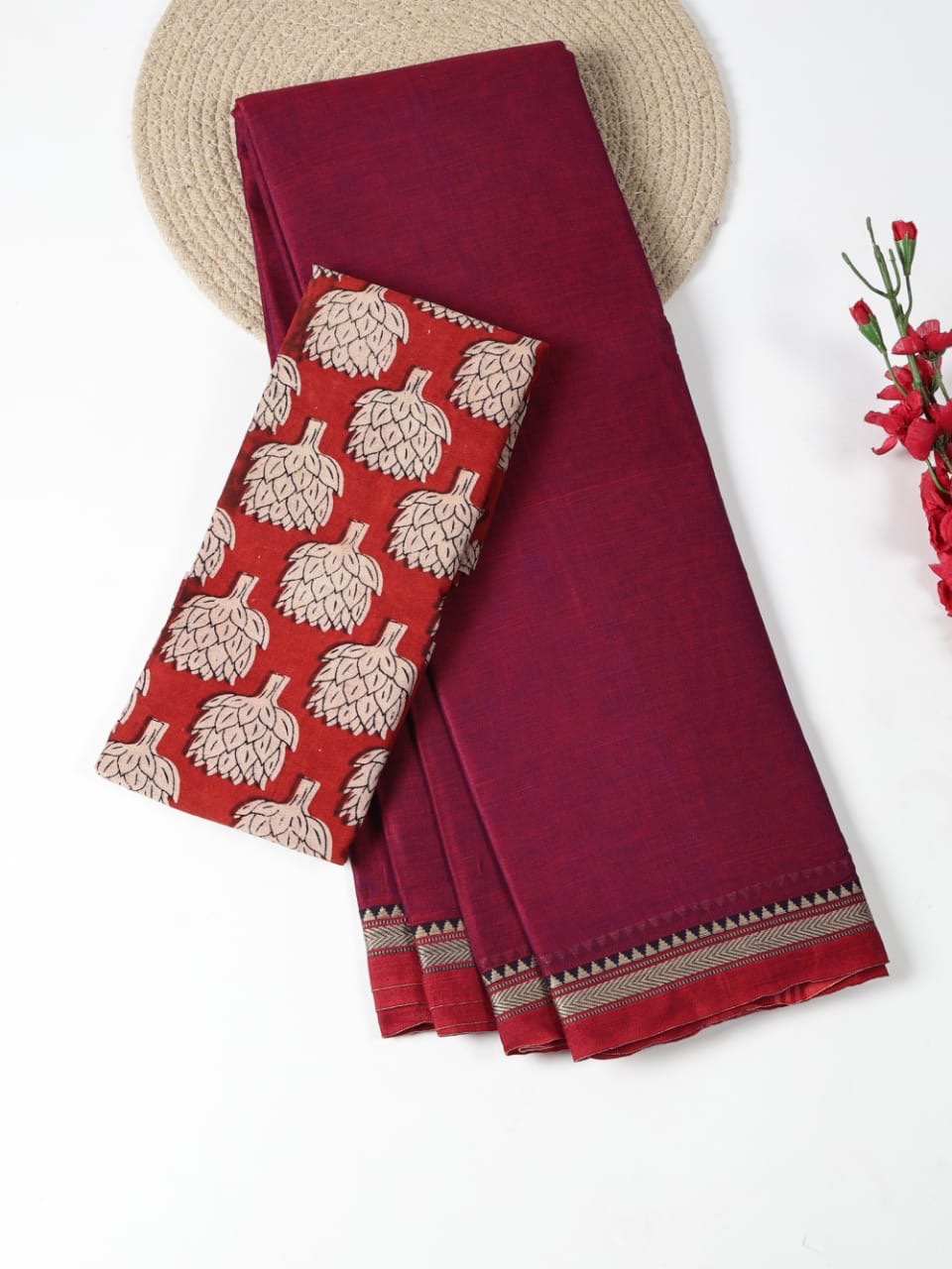 Soft and breathable Narayanpet Mercerized Cotton saree in Magenta with thin Rust thread woven border with simple pallu and tassels. It comes with running blouse and extra Rust Kalamkari cotton blouse.