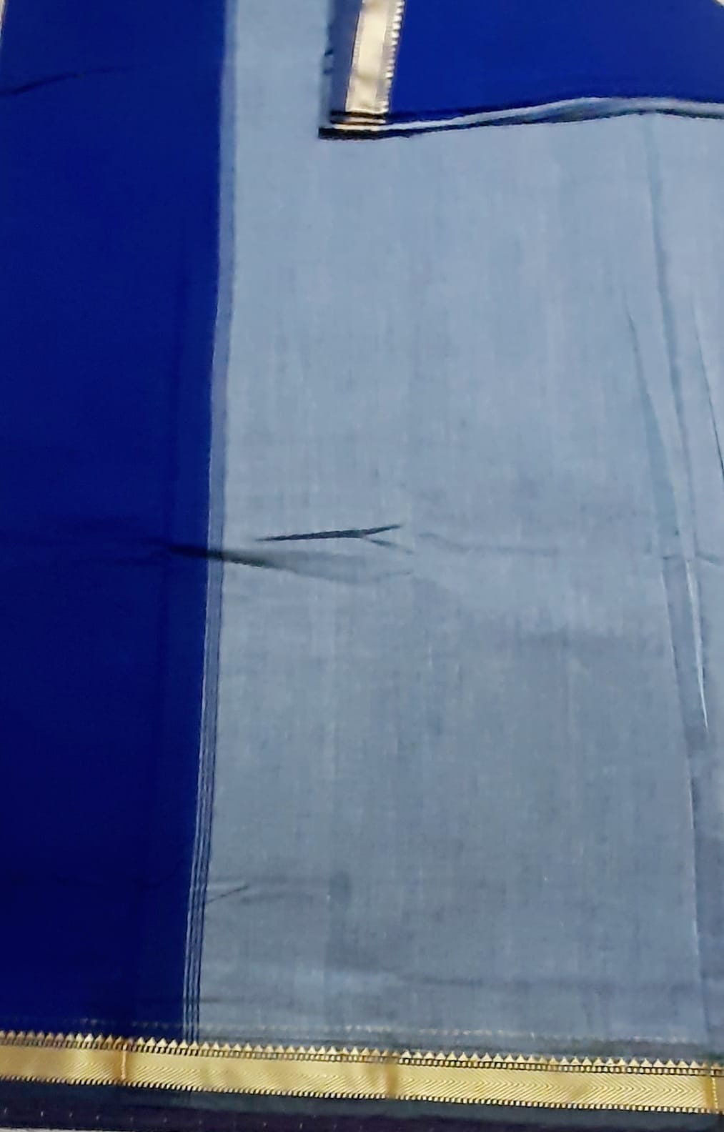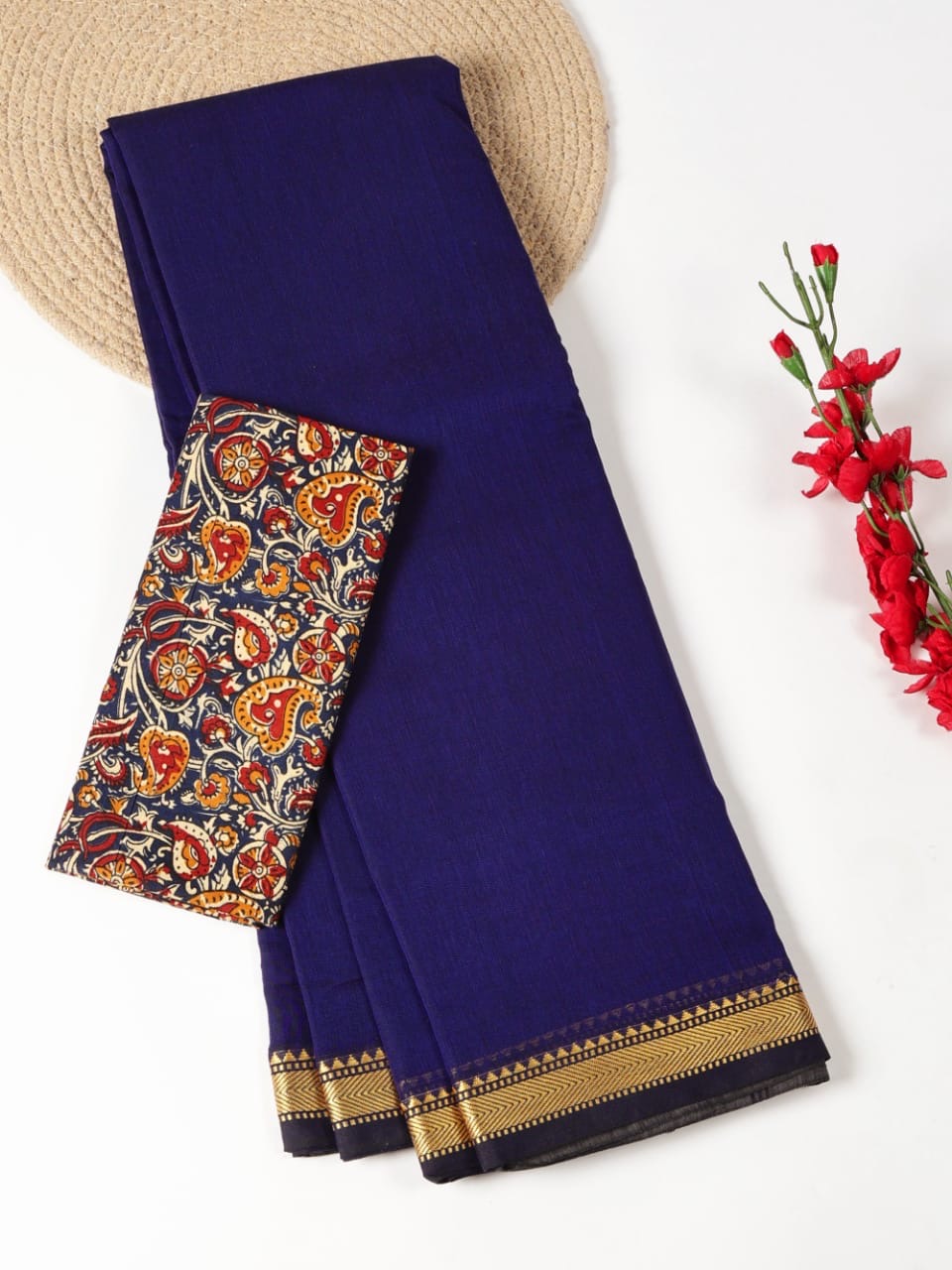 Soft and breathable Narayanpet Mercerized Cotton saree in Royal Blue color with thin Navy Blue thread woven border with simple pallu and tassels. It comes with running blouse and extra Navy Blue Kalamkari cotton blouse.